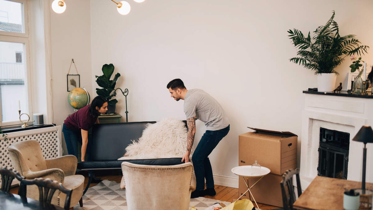 Man and woman arranging sofa in living room